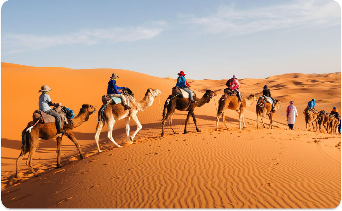 - Переезд в пустыню через Ифран и Мидельт (7-8 ч). Трансфер в кемп на внедорожнике (15-20 мин), прогулка на верблюдах, ночь в шатре среди дюн