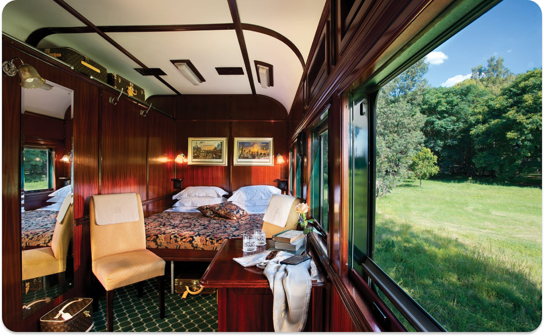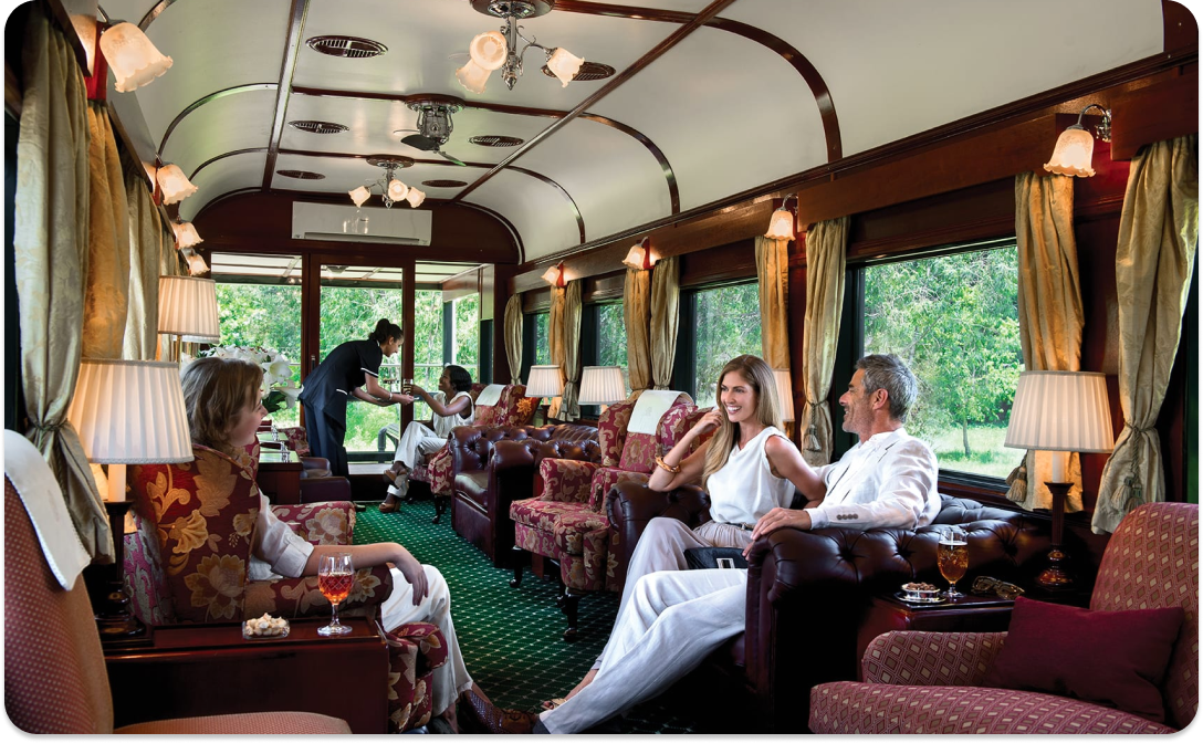<strong>ДОПОЛНИТЕЛЬНО:</strong>; – вагон-гостиная, <br>– вагон-ресторан, <br>– обзорный вагон («The observation car»). <br><br>Этот вагон, расположенный в самом конце поезда, и рассчитанный на 32 персоны, оборудован специальной застекленной задней стенкой. Благодаря такому расположению, из окон вагона можно наслаждаться великолепными пейзажами Африки не выходя из вагона поезда! <br><br>В поезде нет телевидения и радио. Отсутствие этих повседневных удобств устроено специально, для воссоздания подлинной атмосферы 1830-1940-х годов 20 столетия.